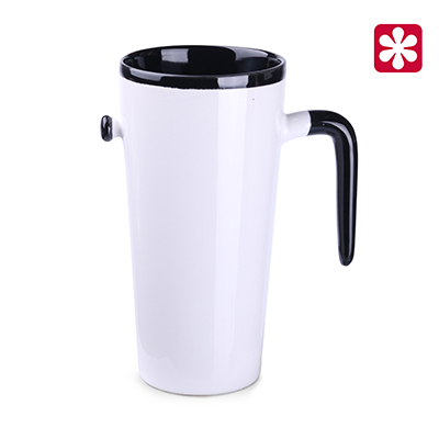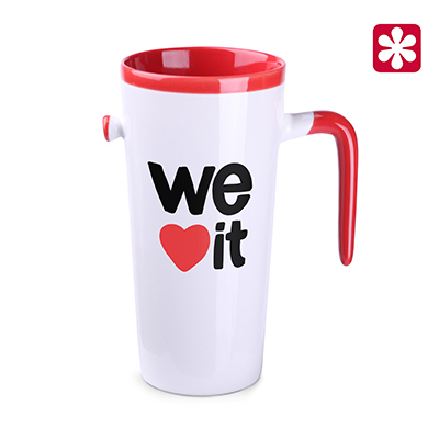 Origineller und auffälliger Becher in fünf Farbvarianten des Innenraums und des Henkels. Die große Druckfläche bietet eine breite Palette von Möglichkeiten für die Markenwerbung. Dieses Produkt ist ein Auslaufmodell und kann Nadelstiche, Punkte sowie Unterschiede im Farbton der Glasur aufweisen.