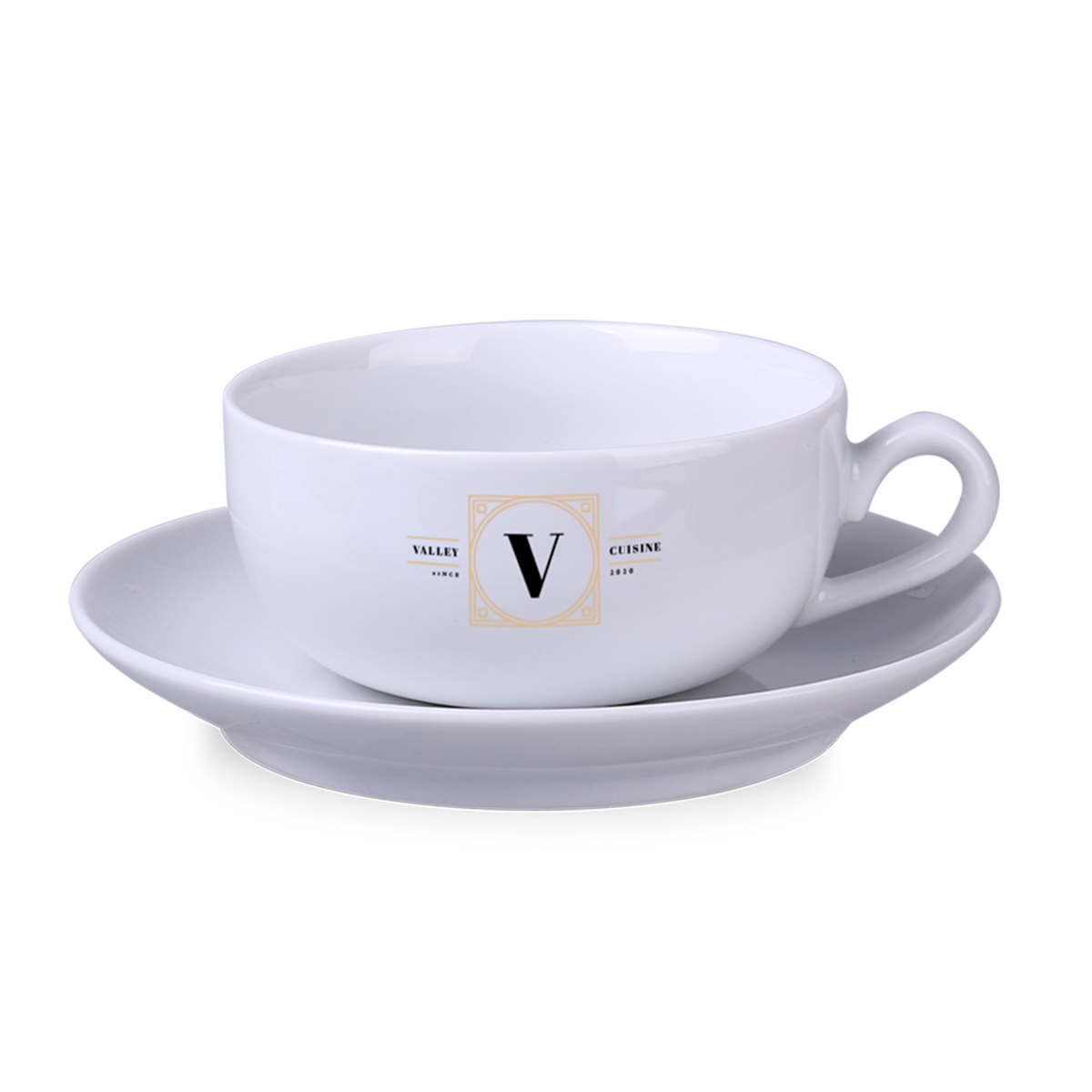 Eine längliche Werbetasse, hergestellt in der polnischen Porzellanfabrik Karolina. Der Schnitt ist in drei Größen erhältlich.