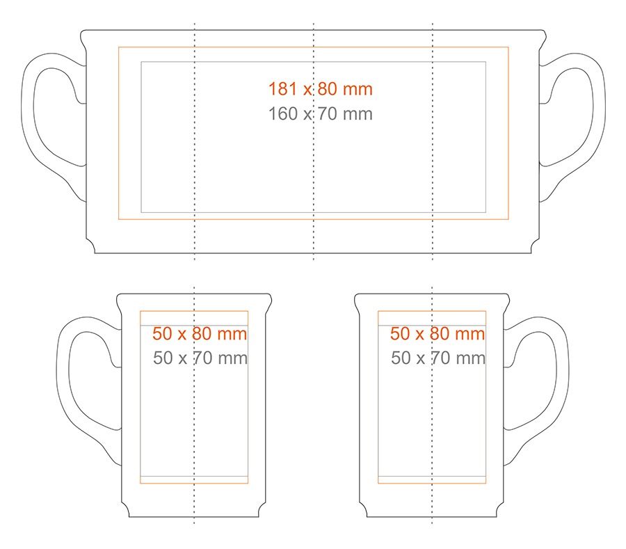 Auf dem Tassengriff (40x6 mm) Auf der Innenwand (40x20 mm) Goldaufdruck Silberaufdruck Druck über den Rand Handarbeit - Einfärbung des Randes Personalisierung Personalisierung Graveur |