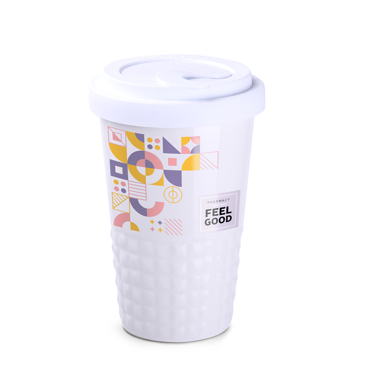 Neuheit auf dem Markt für Werbekeramik. Dezente Ausführung des unteren Tassenbereichs in Form symmetrischer Erhebungen. Doppelwandige Porzellantasse mit hervorragender Wärmeisolierung. Besonders dicht schließender Deckel. Modell für aktive Nutzer. Der Deckel ist in folgenden Farben erhältlich: Weiß, Orange 021C, Cool Gray 7, Marineblau 294C, Braun 4695C, Schwarz, Rosa 4064C, Blau 2144C, Eukalyptus 5493C, Desert Sand 2310C.